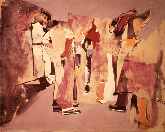 Firmado y fechado áng. inf. izdo.: “Canogar / 66”; firma, inscripción y fecha al dorso: “R. Canogar / ESCENA / URBANA / 1966”
