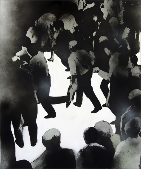 Pintura en spray tratada “a la manera negra” sobre papel metalizado encolado sobre cartón