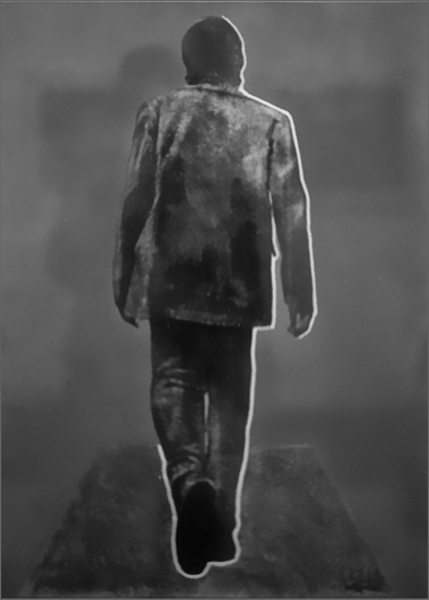 Pintura en spray tratada “a la manera negra” sobre papel metalizado encolado sobre cartón
