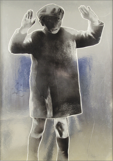 Pintura en spray tratada “a la manera negra” sobre papel metalizado encolado sobre cartón