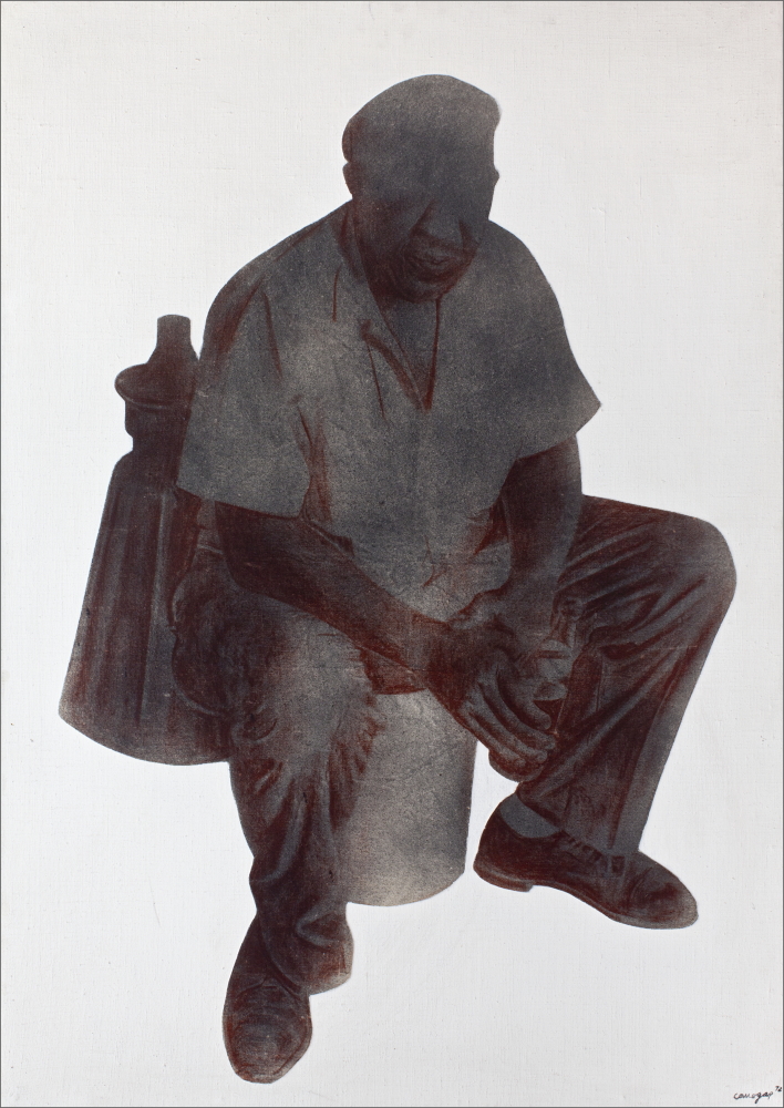 Carboncillo , acrílico y sanguina sobre lienzo recortado y pegado sobre tablero de madera