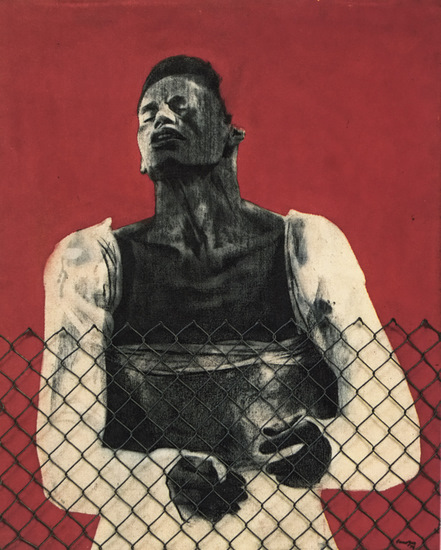 Carboncillo retocado con acrílico y collage de tela metálica sobre lienzo