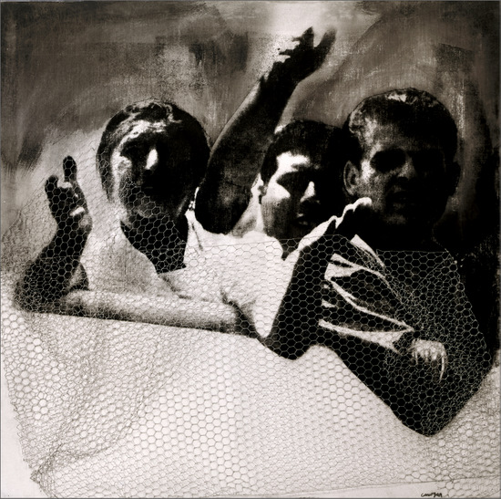 Serigrafía retocada con acrílico y collage de tela metálica sobre lienzo