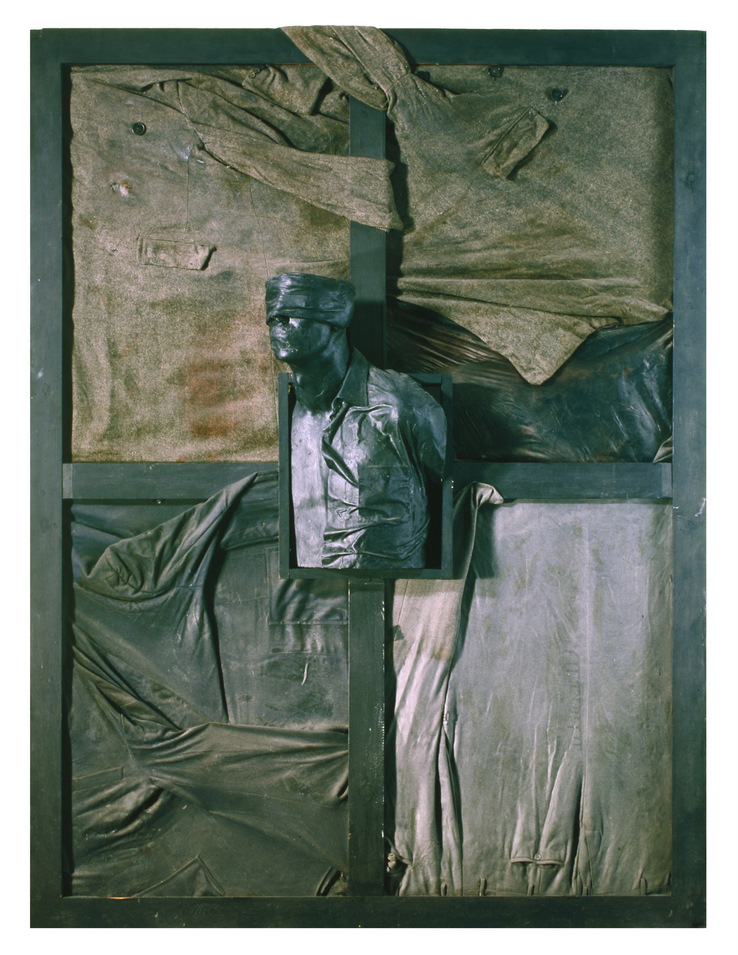Construcción con ropa usada, bastidor de madera y pieza de poliéster y fibra de vidrio pintada al óleo
