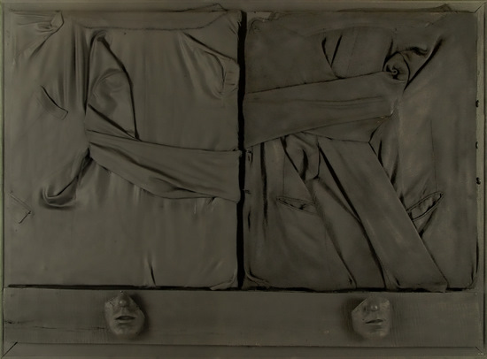 Construcción con ropa usada, panel de madera y piezas de poliéster y fibra de vidrio pintadas al óleo