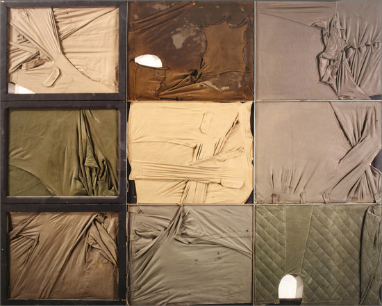 Construcción con ropa usada y bastidores de madera pintados al óleo