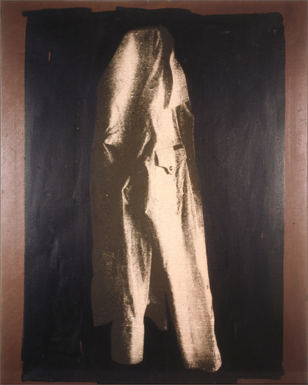Impresión serigráfica silueteada con témpera negra sobre lienzo