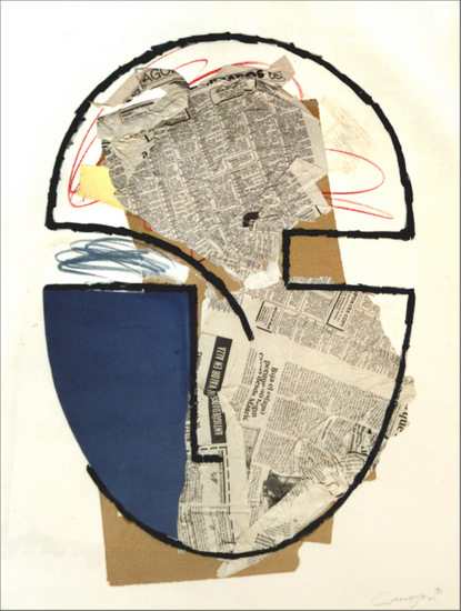 Acrílico, collage de papel de periódico y lápices de color sobre papel