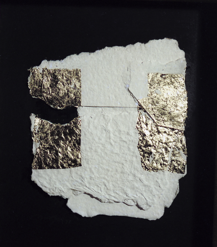 Construcción en papel hecho a mano y pintado al óleo con collage de pan de oro encolado a cartón