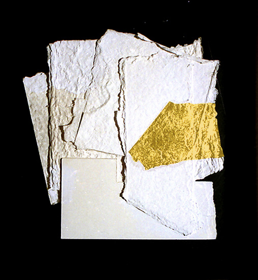 Construcción en papel hecho a mano y pintado al óleo con collage de pan de oro encolado a cartón