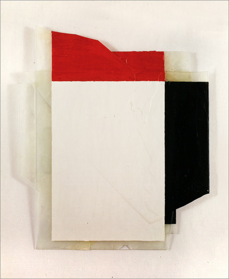 Construcción en cristal, parafina y collage de papel sobre tabla
