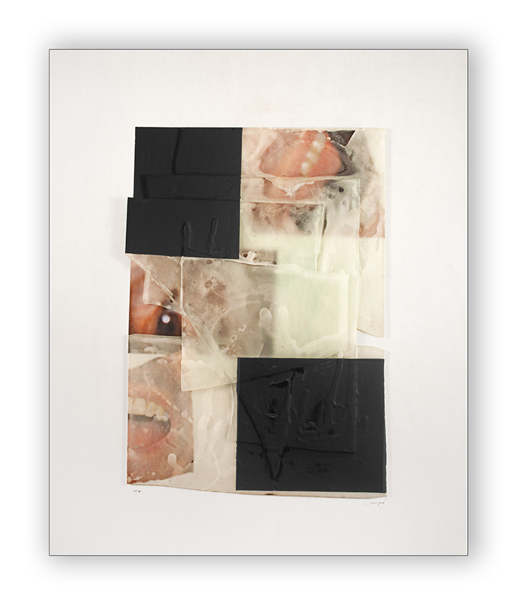 Construcción en cristal, óleo, collage de fotografía y parafina sobre tabla