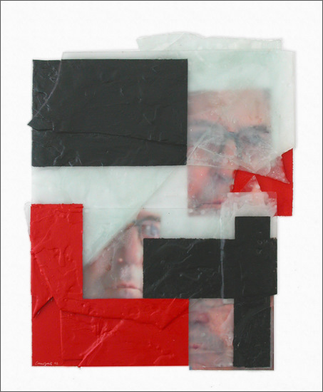 Construcción en cristal, óleo, collage de fotografía y parafina sobre tabla