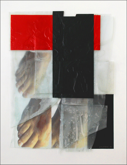 Construcción en cristal, óleo, collage de fotografía y parafina sobre tabla