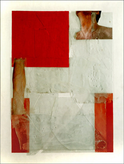 Construcción en cristal, óleo, collage de fotografía y parafina sobre tabla