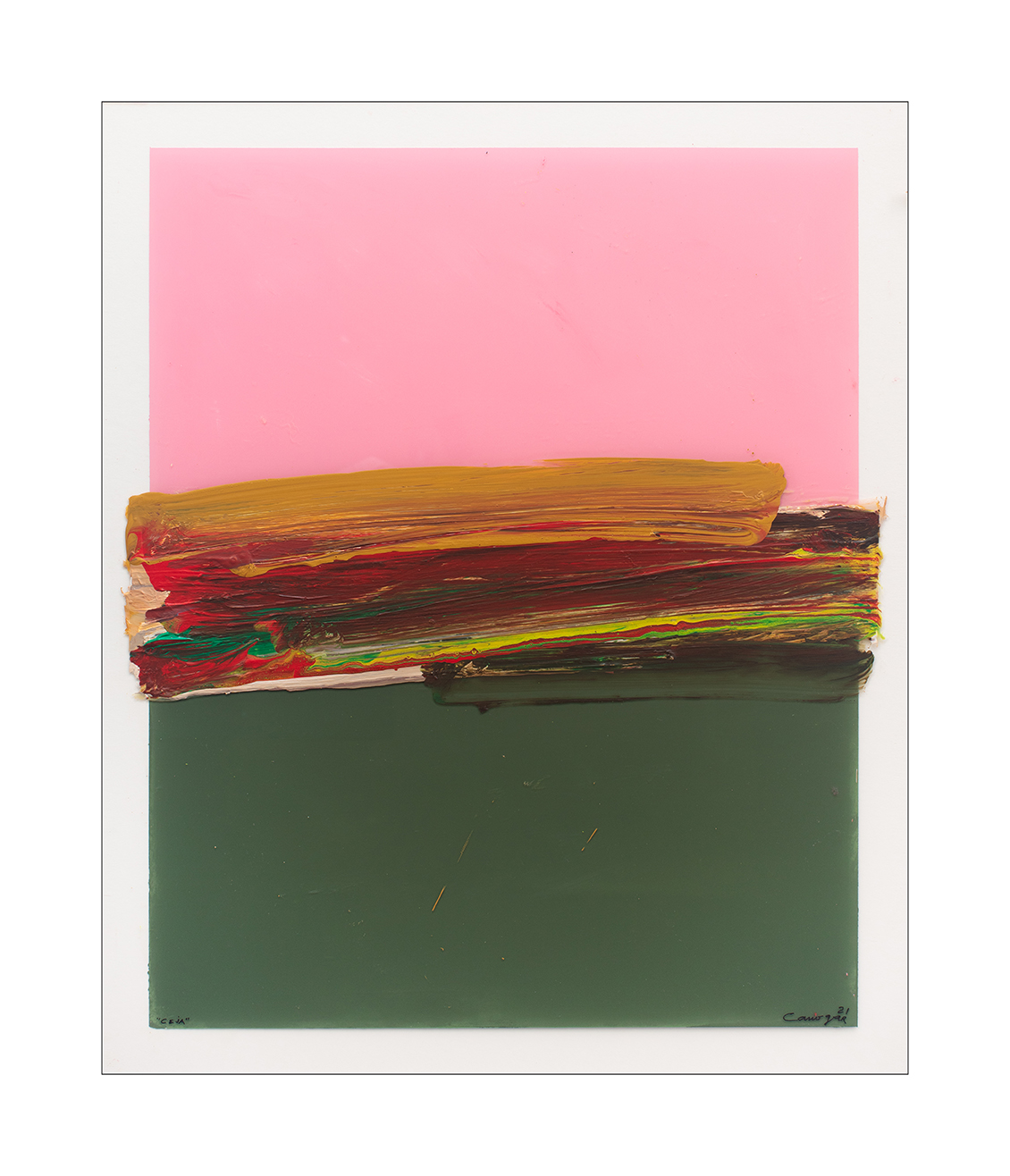 Firmado y fechado zona. inf. dcha.: “Canogar ´21”; inscripción zona inf. izqda.: “CEJA”